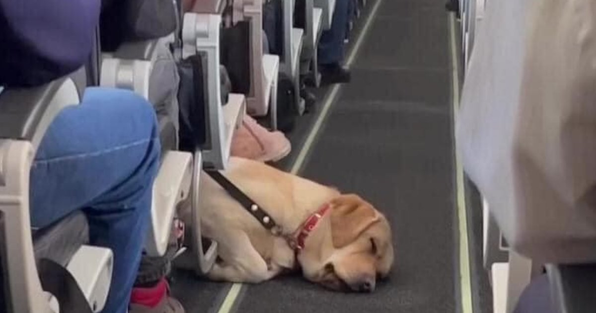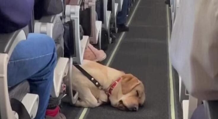 A flight attendant on duty during a flight could not help but notice a Labrador Retriever sleeping soundly on the floor next to its master. It instantly fell asleep due to exhaustion, and its upper body was visible on the passenger aisle. The stewardess thought the sleeping dog was very cute, so she took a video and shared it on social media. Various reactions came pouring in, and some netizens questioned, “How did that dog get into the plane with the passengers?” Some reactions caused heated discussions on social media.