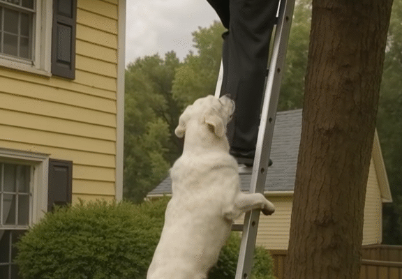 I placed the ladder against the trunk and tested its steadiness. As soon as my boot touched the first rung, Max froze. His entire body went rigid, his eyes locked on mine with a tension I hadn’t seen before. I dismissed it with a quick laugh. “Relax, buddy. I’ll be down in a minute.” I climbed another rung, and that’s when I felt the tug. Not a gentle nudge—this was a sharp, insistent pull at the cuff of my trousers. I looked down, startled, and saw Max clamped onto the fabric, teeth gripping hard enough that I nearly slipped. “Hey! What’s gotten into you?” I said, trying to shake him off without hurting him. He wouldn’t let go. He braced himself, digging his paws into the dirt, eyes wild with a warning I didn’t understand.